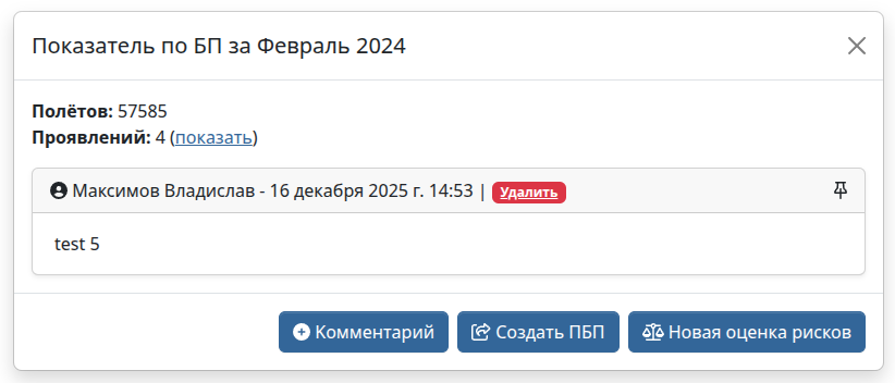 При нажатии на него или на названия месяца под столбиком открывается всплывающее окно, в котором можно создать Предупреждение по безопасности полётов, новую оценку рисков или оставить комментарий. Также, в окне можно увидеть информацию об уже созданных ПБП и оценках рисков, комментариях а также посмотреть сообщения, из которых состоит показатель за выбранный период.